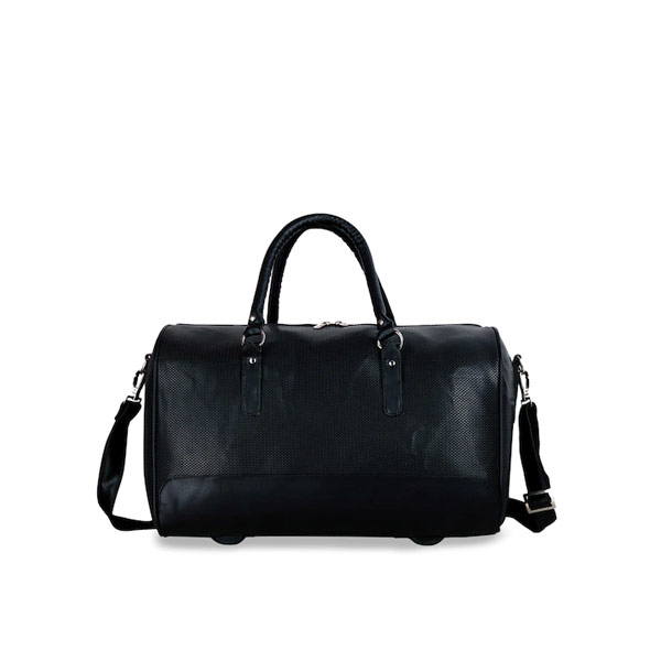 Black solid leather duffel bag, has two short handles, and one detachable and adjustable shoulder strap